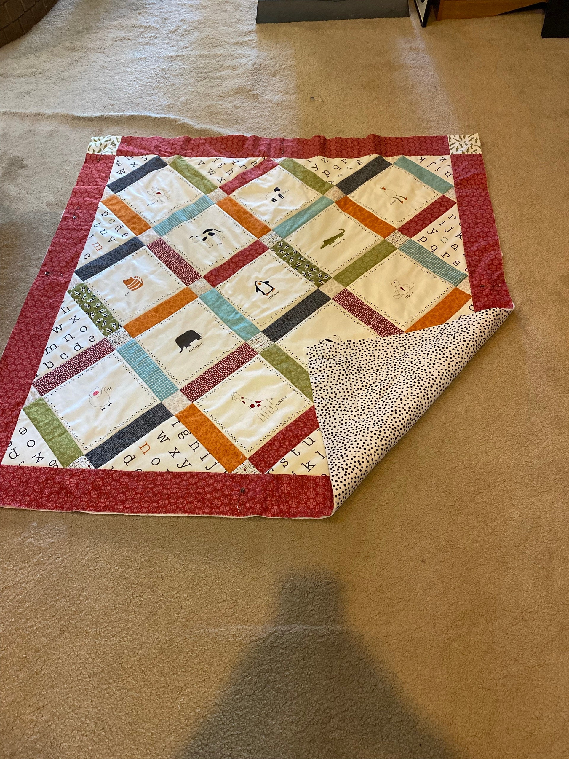 Pattern to create a 40" x 49" quilt. This pattern will be sent to you as a download. Fabric featured in this quilt is Animal Crackers by Sweetwater. Please be aware that this pattern requires the Animal Crackers animal panel.